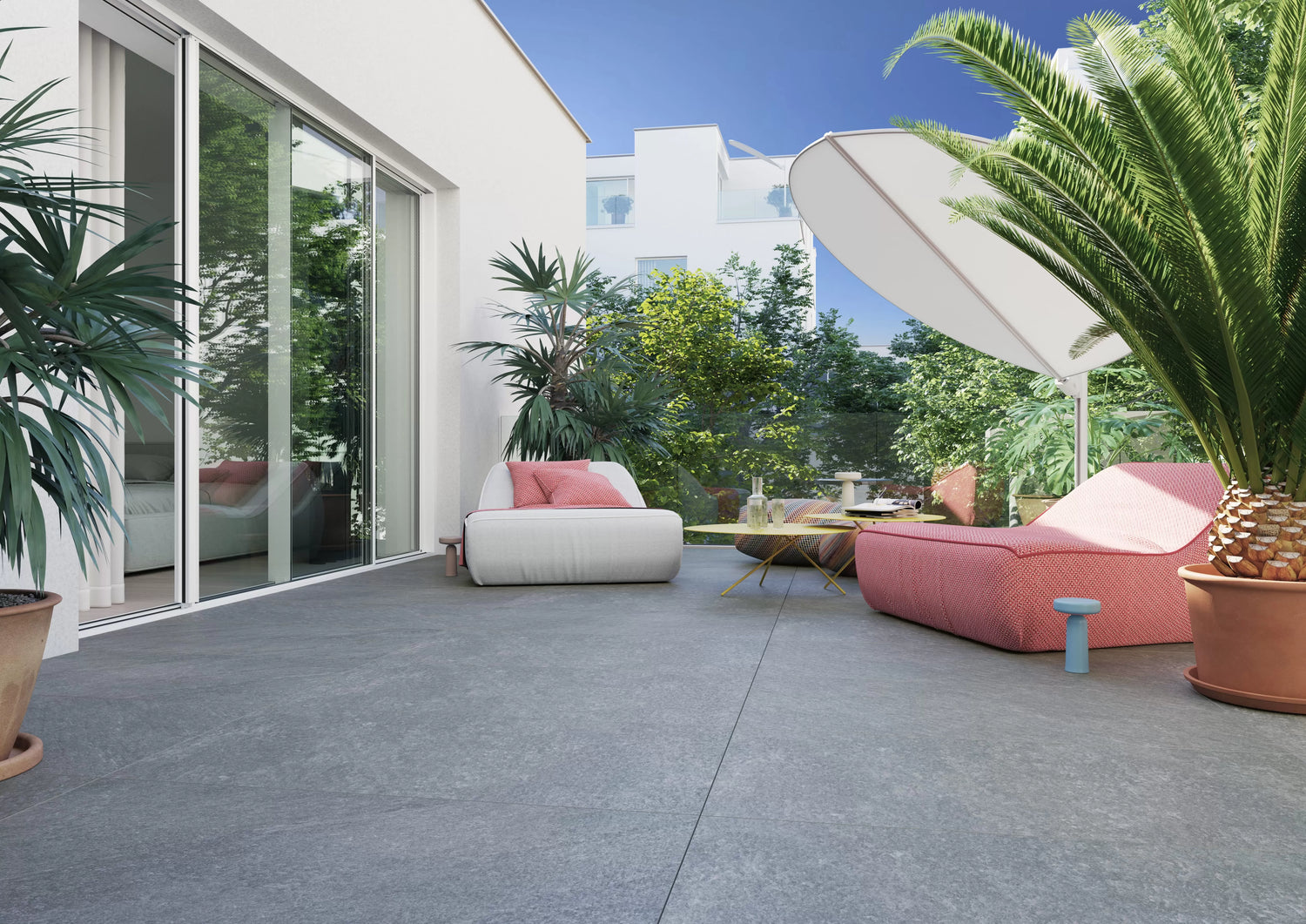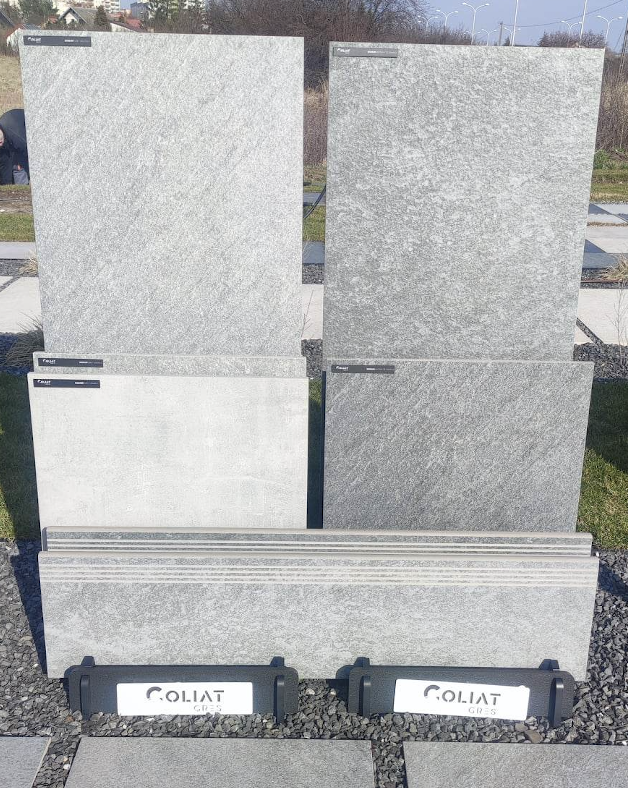 Aktualnie dostępna ekspozycja dotyczy wyłącznie kolekcji gresów. Pergole, meble i oświetlenie będą sukcesywnie dołączane – pełna aranżacja dostępna w drugiej połowie roku.